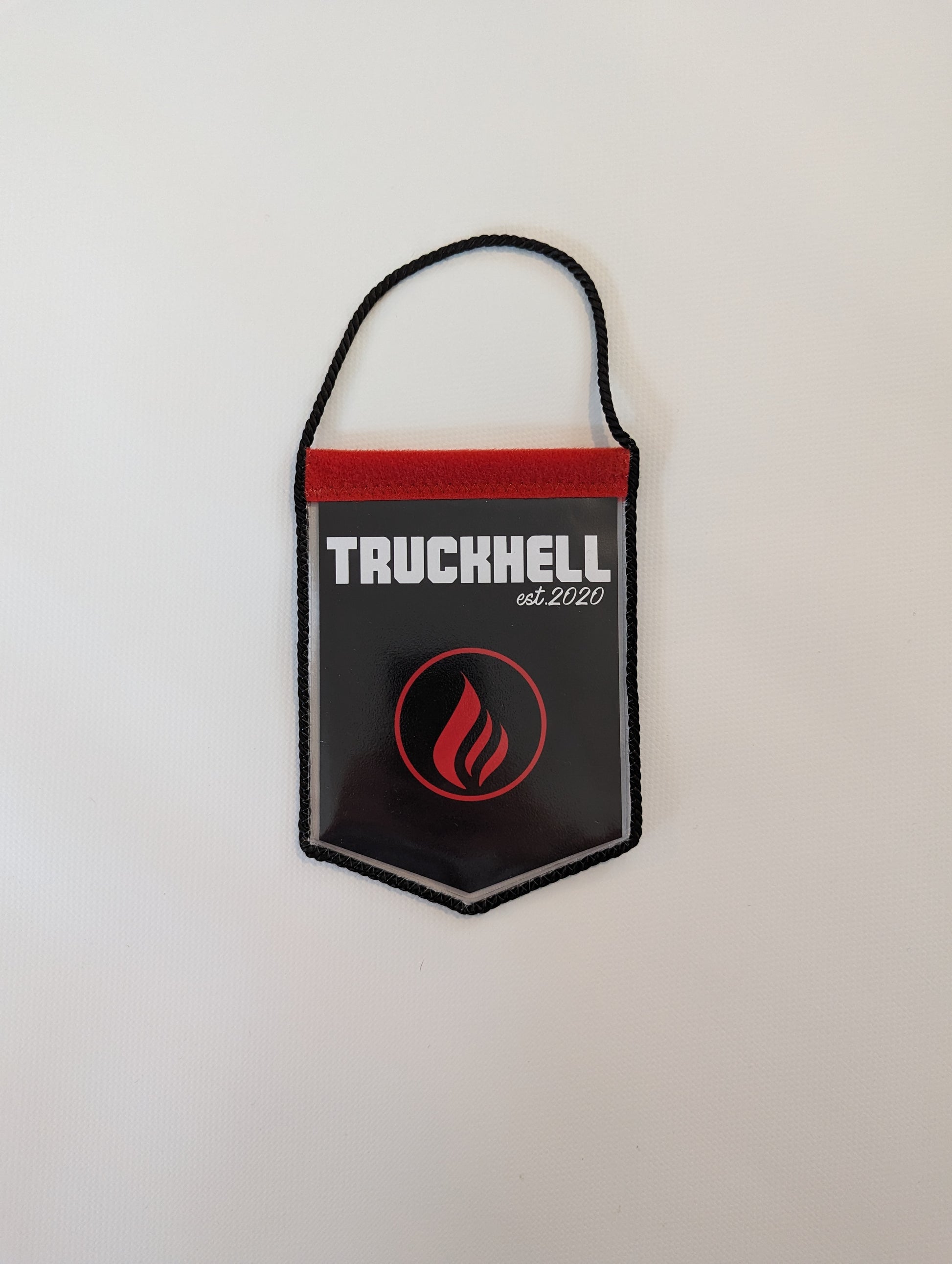 Roter Wimpel mit dem Truckhell-Logo, erhältlich in verschiedenen Ausführungen, perfekt zur individuellen Gestaltung des Cockpits. 1. Seite weiß, 2. Seite schwarz
